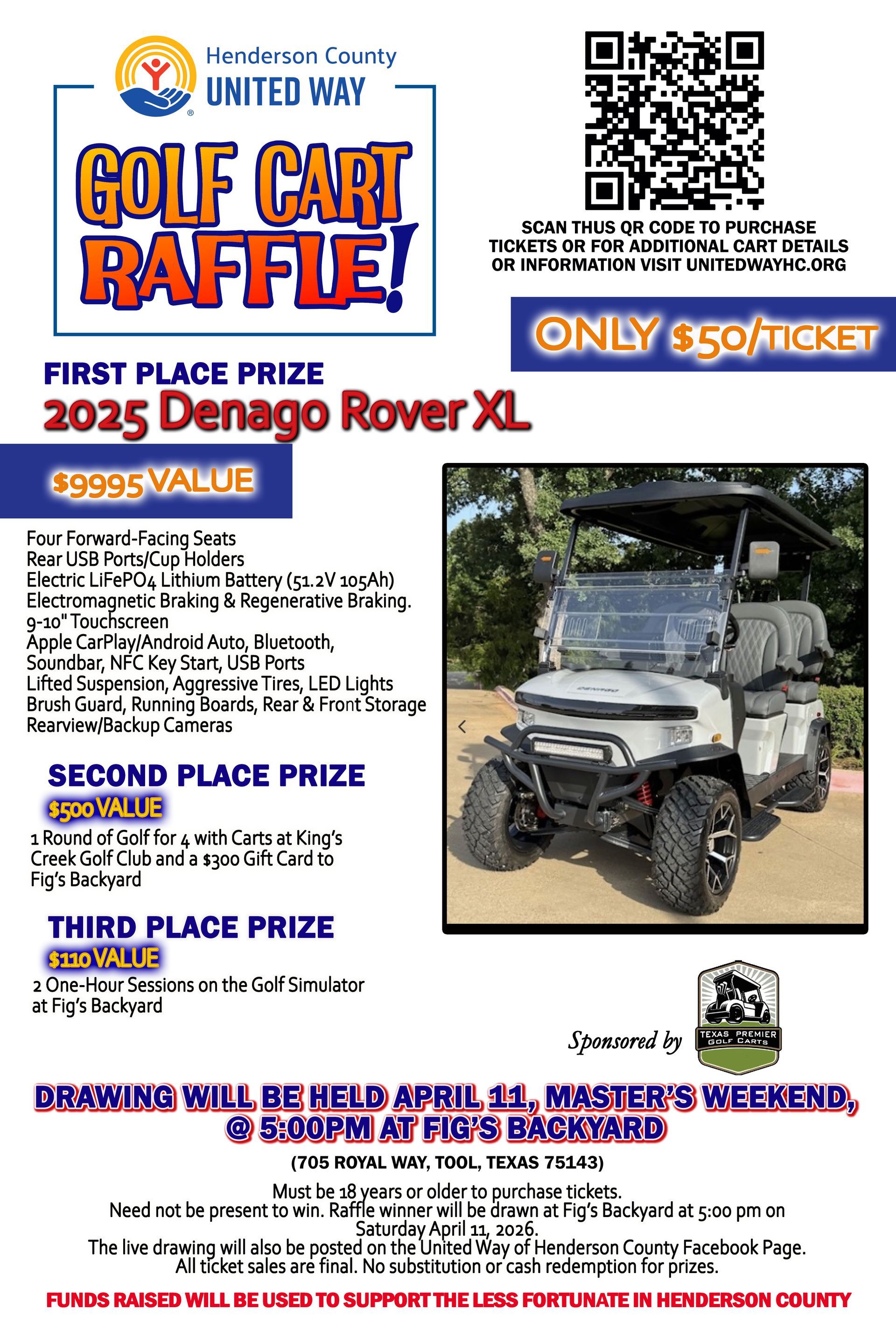 Thanks for participating in the 2025 Henderson County United Way Golf Cart Raffle! The Henderson County United Way golf cart raffle has announced its winners. Michele Smith and Richard Avery took home the top prize, a golf cart and 12-foot utility trailer. Carolyn Tolley came in second, winning a golf round for four people, including a cart, and a $300 gift certificate to Figs Backyard. Alan Drummond secured the third-place prize, consisting of two one-hour sessions on the golf simulator at Figs Backyard. 1st Place: Golf Cart & 12' Utility Trailer: Michele Smith & Richard Avery 2nd Place: Golf round for (4) + Cart, and $300 Figs Backyard Gift Certificate: Carolyn Tolley 3rd Place: 2-One hour sessions on the Golf Simulator at Figs Backyard: Alan Drummond